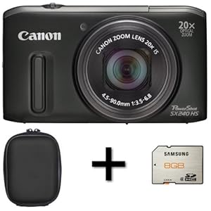 Shop Smarter and Save Money on Canon Powershot SX240 HS Digital Camera Black + Case and 8GB Memory Card 12.1 MP, 20x Optical Zoom 3 Inch LCD. The PowerShot SX240 HS is slim and compact yet it boasts an impressive 20x optical zoom. It is also packed with Canon features to help you capture great shots, effortlessly, making it an ideal camera for all family trips and occasions. Canon's HS System and Intelligent IS help ensure your images are sharp, clear and vibrant whatever the light conditions, whilst full HD movies allow you to capture all the action in perfect detail.Features include:25 mm wide-angle lens with 20x optical zoom, extending to 39x with ZoomPlusOptical Image Stabilizer with Intelligent IS12.1 megapixel high-sensitivity CMOS sensorCanon's HS System, featuring a DIGIC 5 processor for excellent low-light performanceAdvanced full HD movies (1080p) and HDMI-CECLarge 7.5 cm (3.